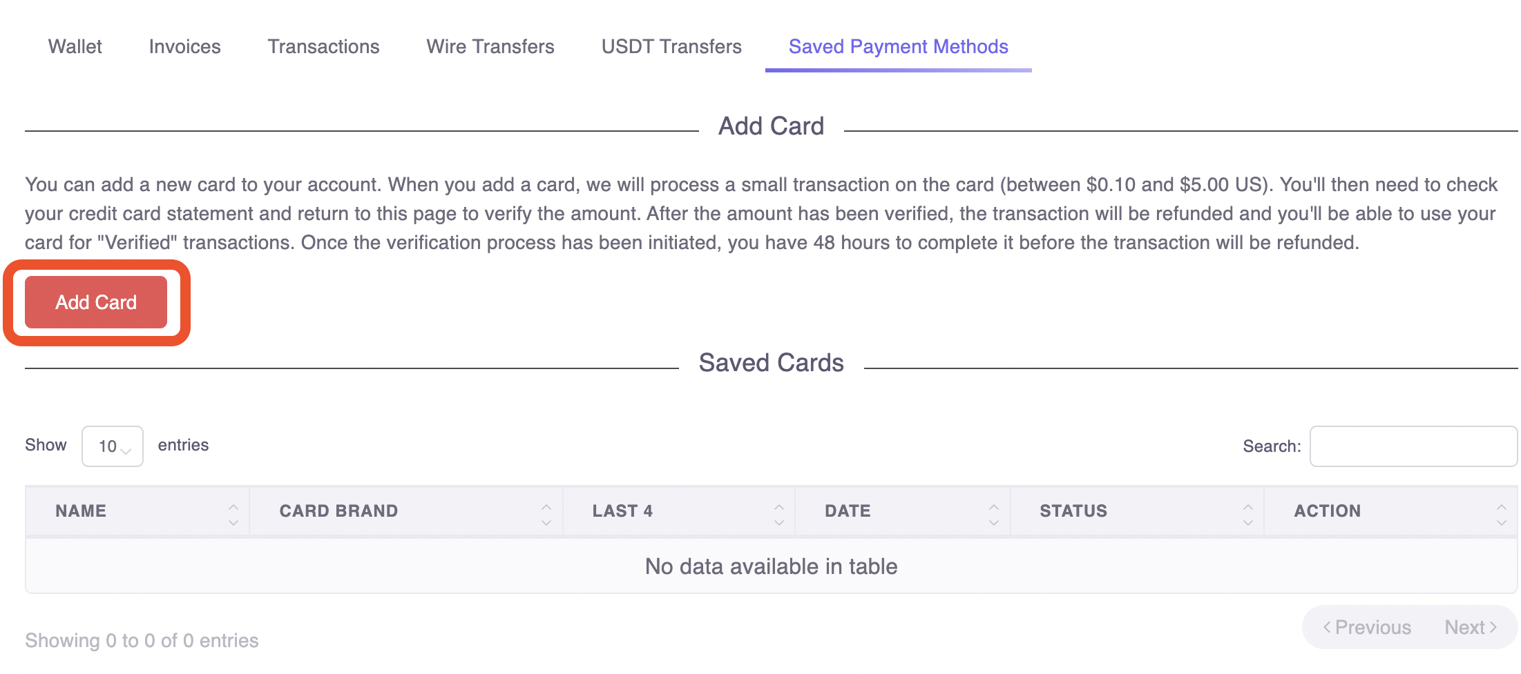 - When you add a card, we will process a small transaction on the card (between $0.10 and $5.00 US). You'll then need to check your credit card statement and return to this page to verify the amount. After the amount has been verified, the transaction will be refunded and you'll be able to use your card for "Verified" transactions. Once the verification process has been initiated, you have 48 hours to complete it before the transaction will be refunded.